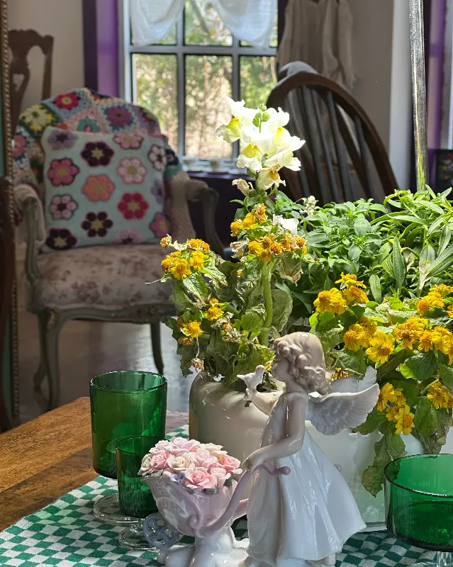 테이블 위에는 꽃과 찻잔, 앙증맞은 소품들이 놓여 있어 마치 인형의 집을 방문한 듯한 기분을 선사한다.