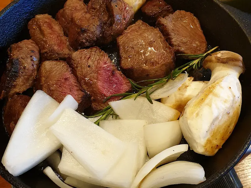 가장 먼저 등장한 것은 스테이크. 400g의 넉넉한 양에, 겉은 갈색으로 먹음직스럽게 익고 속은 촉촉한 육즙을 머금은 모습이었다. 160도에서 일어나는 마이야르 반응 덕분에 표면에는 완벽한 갈색 크러스트가 형성되어 있었다. 젓가락으로 집어 들어보니, 탄력 있는 육질이 느껴졌다. 스테이크는 손님이 직접 구워 먹는 방식이었는데, 살짝 귀찮을 수도 있지만, 오히려 자신의 취향에 맞게 굽기를 조절할 수 있다는 점이 매력적이었다. 나는 미디엄 레어를 선호하므로, 불판에 올려 겉면을 재빨리 익히고, 육즙이 빠져나가지 않도록 주의하며 구웠다.