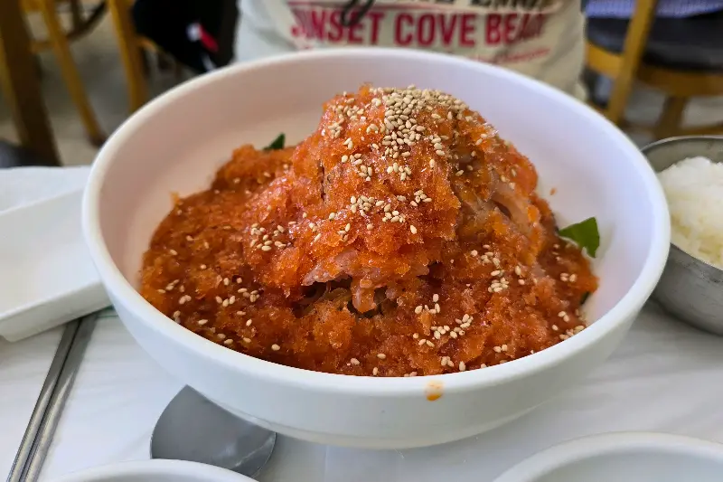 물회를 정신없이 흡입하고 있는데, 사장님께서 오시더니 “혹시 밥 더 필요하세요?”라고 물어보시는 거야. 완전 친절하시잖아! 그래서 밥 한 공기 추가해서 물회에 말아 먹었어. 차가운 육수에 따뜻한 밥이 섞이니까, 또 다른 맛이 나더라. 진짜 꿀맛!