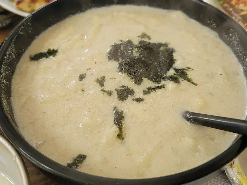 뽀얀 국물에 김 가루가 뿌려진 들깨 수제비
