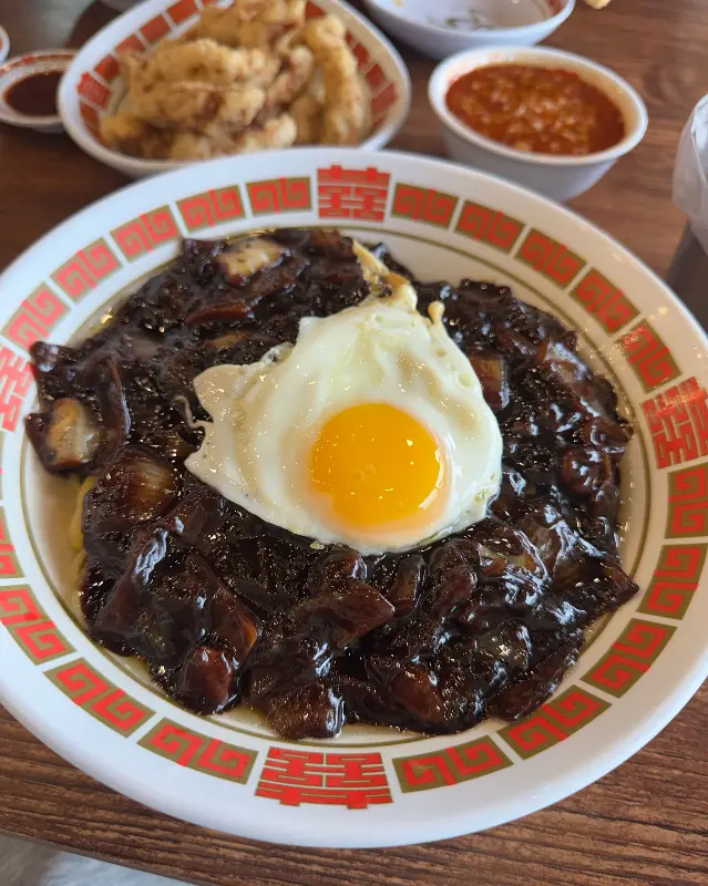 다음 타자는 짜장면. 윤기가 좔좔 흐르는 짜장 소스 위에, 앙증맞은 계란후라이가 톡! 비주얼부터가 이미 게임 끝났어. 젓가락으로 면을 휘휘 저어 한 입 맛보니, 진하고 깊은 짜장의 풍미가 입안 가득 퍼져 나갔어. 면발은 어찌나 탱글탱글한지, 마치 내 랩처럼 탄력이 넘치더라. 짜장 소스, 면, 계란후라이의 조화가 환상적이었어.