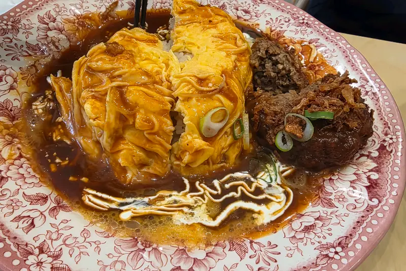 오므라이스 비주얼, 진짜 미쳤다! 촉촉하고 부드러운 계란이 밥을 감싸고 있고, 그 위에 윤기가 좔좔 흐르는 돈까스가 얹어져 있었다. 소스 색깔도 예술! 어떻게 이런 비주얼이 나올 수 있지? 감탄사가 절로 나왔다.