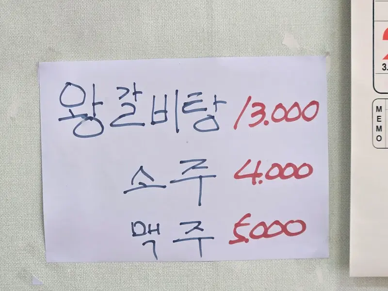 드디어 가게 안으로 입성! 밖에서 풍겨오는 진한 육향이 코를 찌른다. 테이블은 고작 6개 남짓. 좁다 좁아. 🤣 어쩔 수 없이 다른 손님과 합석했다. 뭐, 맛있는 갈비탕 앞에서는 어색함도 사치지! 벽에 붙은 메뉴판은 심플 그 자체. ‘왕갈비탕 13,000원’, 그리고 ‘소주 4,000원, 맥주 5,000원’ . 아, 갈비탕에 소주 한 잔 캬~ 하는 상상을 잠시 했지만, 오늘은 꾹 참기로 했다. 오픈 시간 아니면 눈치 보여서 쉽지 않다는 후기들이 많았으니까. (혼잣말) 아쉽다…