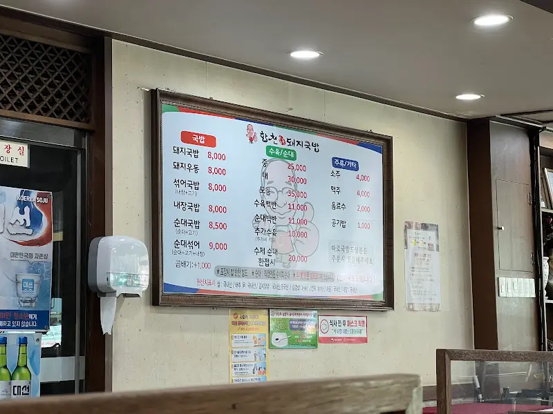 다양한 메뉴를 자랑하는 합천일류돼지국밥의 메뉴판. 국밥 종류도 다양하지만, 수육백반과 돼지우동도 인기 메뉴다.