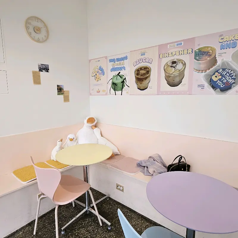 카페 문을 열자, 파스텔톤의 아기자기한 인테리어가 눈에 들어왔다. 은은하게 퍼지는 달콤한 냄새와 따뜻한 조명이 어우러져, 마치 동화 속에 들어온 듯한 기분이 들었다. 벽면에는 손님들이 주문 제작한 듯한 예쁜 레터링 케이크 사진들이 가득 붙어 있었는데, 하나하나 구경하는 재미가 쏠쏠했다.