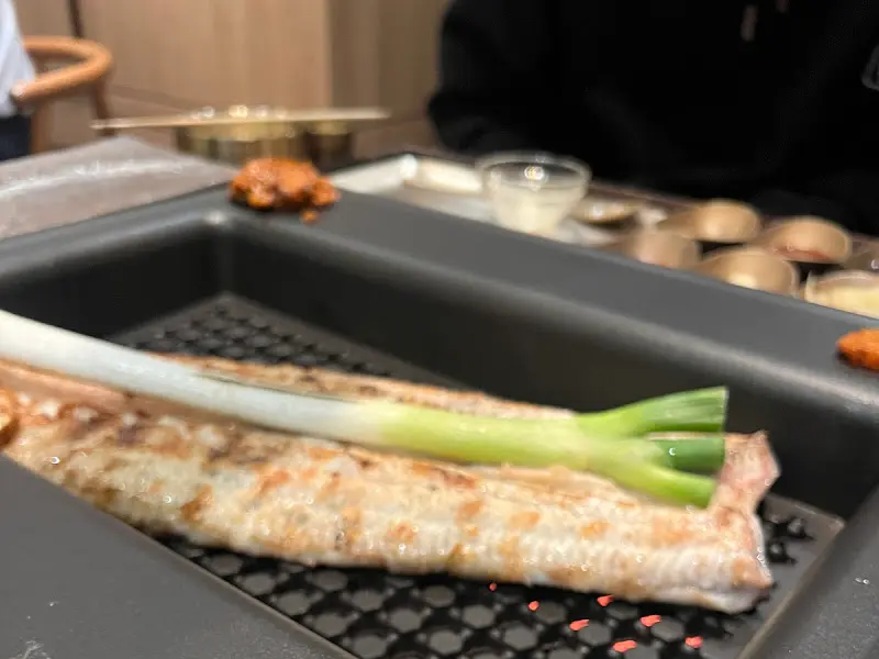 잠시 후, 드디어 기다리고 기다리던 갯벌장어가 등장했다. 숯불 위에서 지글거리는 소리와 함께, 고소한 냄새가 코를 자극했다. 직원분은 능숙한 솜씨로 장어를 구워 주셨다. 겉은 바삭하고 속은 촉촉하게 구워진 장어는 보기만 해도 군침이 돌았다. 장어와 함께 구워지는 대파의 향긋한 향은 식욕을 더욱 돋우었다.