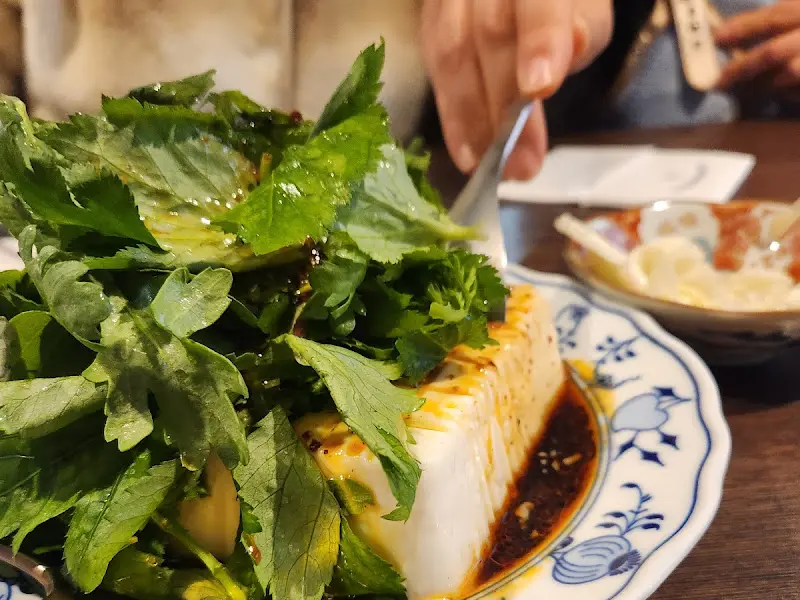 연두부의 부드러움, 채소의 향긋함, 칠리오일의 매콤함! 이 조합, 완전 칭찬해!