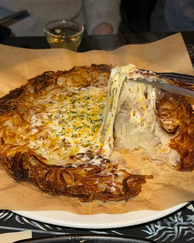두 번째 메뉴는 ‘치즈 감자전’이었다. 노릇노릇하게 구워진 감자전 위에 아낌없이 뿌려진 치즈가 먹음직스러워 보였다. 젓가락으로 쭈욱 늘어나는 치즈를 보니, 저절로 군침이 돌았다. 감자전의 바삭함과 치즈의 고소함, 그리고 짭짤함이 완벽하게 어우러졌다. 특히, 금복주류의 치즈 감자전은 겉은 바삭하고 속은 촉촉해서 더욱 특별했다. 뜨거울 때 먹으니 치즈가 입안에서 사르르 녹아내리는 듯했다. 막걸리와 함께 먹으니 그 조화가 정말 최고였다.