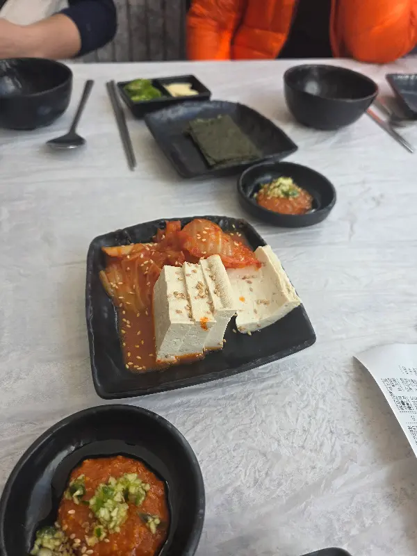 주문을 마치자, 기다렸다는 듯이 밑반찬들이 테이블 위를 가득 채웠다. 따뜻한 어묵탕이 추위를 녹여주었고, 부드러운 계란찜은 입맛을 돋우었다. 묵은지와 두부의 조합은 신선하면서도 절묘했고, 콘치즈는 달콤한 향기로 식욕을 자극했다. 하나하나 정성이 느껴지는 밑반찬들은, 메인 요리에 대한 기대감을 더욱 높였다.