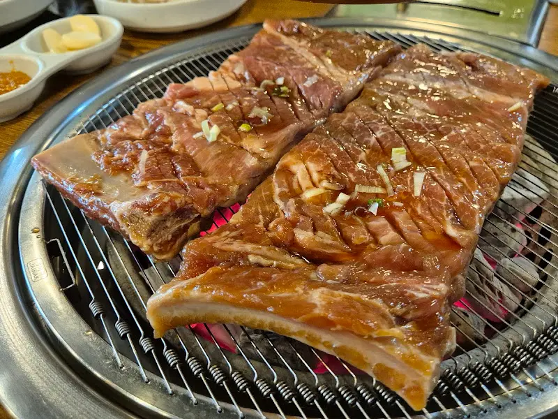 에서 보이는 것처럼, 숯불 위에서 노릇노릇하게 익어가는 돼지갈비는 정말이지 최고의 비주얼을 자랑했다. 육즙이 좔좔 흐르는 돼지갈비를 보니, 저절로 젓가락이 향했다.
