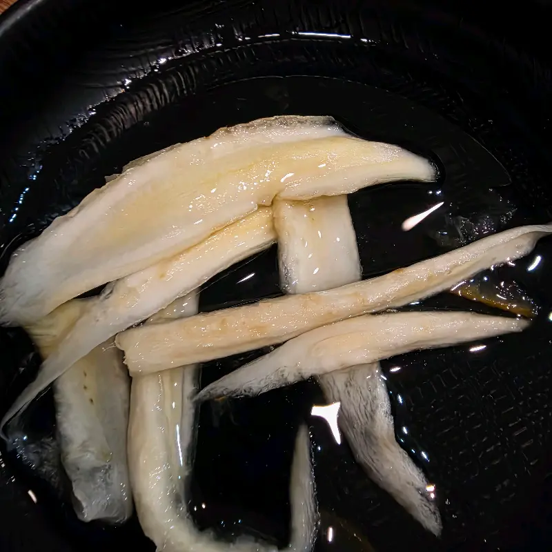 주문 후, 정갈하게 차려진 밑반찬들이 식탁을 가득 채웠다. 싱싱한 야채 샐러드는 입맛을 돋우기에 충분했고, 슴슴하게 무쳐낸 나물은 고기의 풍미를 더욱 깊게 만들어줄 것 같았다. 특히, 얇게 슬라이스된 백목이버섯이 독특한 식감을 자랑하며 시선을 사로잡았다. 맑은 물에 담겨 나온 모습이 마치 투명한 조각 작품 같았다.