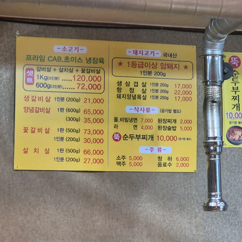 4. 메뉴: 프라임 CAB 초이스 생 꽃갈비살은 꼭 드셔보세요. 입 안에서 살살 녹는 맛이 일품입니다. 또한, 생갈비살양념갈비살도 빼놓을 수 없는 메뉴입니다.