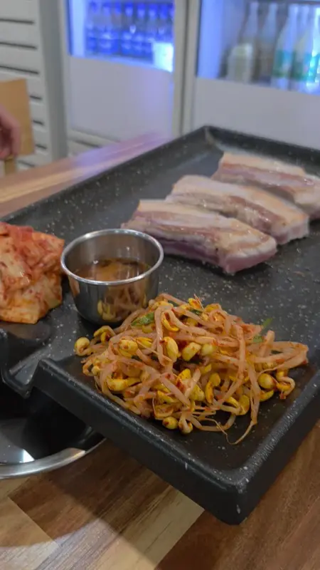 문을 열자, 따뜻한 기운과 함께 정겨운 분위기가 나를 감쌌다. 테이블은 이미 손님들로 북적였고, 왁자지껄한 웃음소리가 활기찬 공간을 가득 채우고 있었다. 여행객보다는 현지인들이 많이 찾는 듯했다. 나는 구석 자리에 앉아 메뉴판을 펼쳐 들었다. 흑돼지 오겹살과 목살, 된장찌개 등의 메뉴가 눈에 들어왔다. 고민 끝에, 제주에 왔으니 흑돼지 오겹살을 맛봐야겠다는 생각에 2인분을 주문했다.