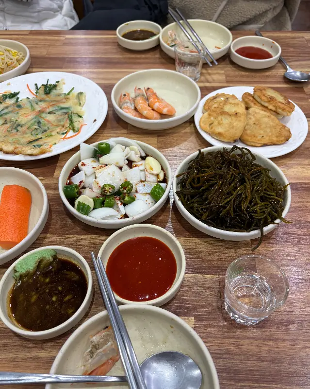 다채로운 밑반찬이 풍성하게 차려진 테이블