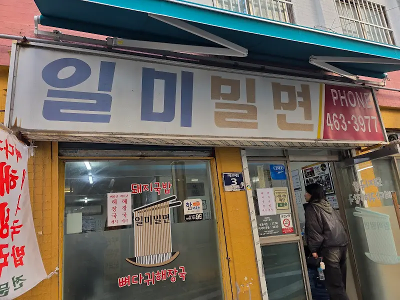 나는 좁다란 골목길을 따라 걸어갔다. 평일임에도 불구하고 가게 앞에는 이미 20여 명의 사람들이 줄을 서 있었다. 역시, 진정한 맛집은 기다림마저 설레게 하는 법이지. 기다리는 동안 가게 외관을 살펴보았다. 빛바랜 간판에는 ‘일미밀면’이라는 상호와 함께 전화번호가 적혀 있었고, 그 옆으로는 밀면과 돼지국밥을 홍보하는 작은 안내문이 붙어 있었다. 세월의 흔적이 느껴지는 외관과는 달리, 가게 안은 깔끔하게 정돈되어 있었다.