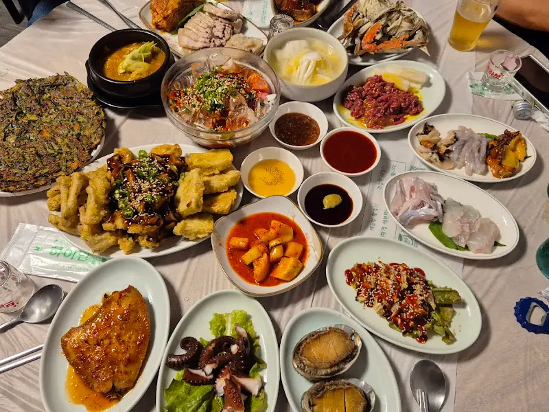 자리에 앉자마자 아주머니께서 쉴 새 없이 반찬을 가져다주셨다. 처럼 테이블은 순식간에 푸짐한 한 상으로 가득 채워졌다. 뽀얀 김이 피어오르는 따뜻한 두부김치, 매콤한 양념에 버무려진 새콤달콤한 가오리 무침, 짭짤하면서도 고소한 맛이 일품인 해물파전, 꼬들꼬들한 식감이 살아있는 싱싱한 해산물까지… 눈으로 보기만 해도 군침이 절로 넘어갔다. 특히 투명한 유리 그릇에 담겨 나온 가오리 무침은, 큼지막한 얼음 조각 덕분에 더욱 시원하고 청량하게 느껴졌다. 에서 보이는 싱싱한 고추와 깨소금이 넉넉히 뿌려진 모습은 입맛을 더욱 자극했다.