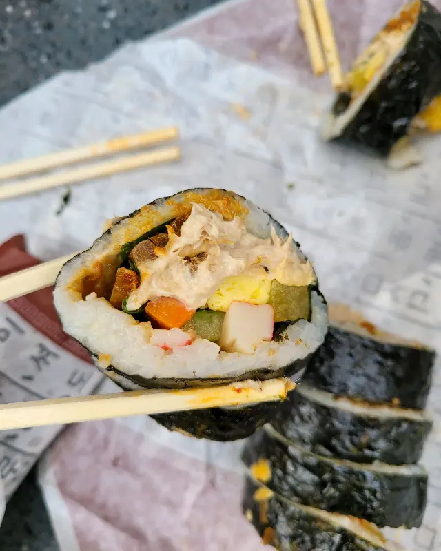 나루터 김밥의 또 다른 매력은 바로 ‘타코야끼 김밥’이었다. 겉모습은 평범한 김밥과 다를 바 없었지만, 속 안에는 쫄깃한 문어가 들어 있었다. 김밥 위에 뿌려진 가쓰오부시와 불닭 소스가 타코야끼의 풍미를 더했다. 톡톡 터지는 문어의 식감과 매콤한 소스의 조화가 묘하게 중독적이었다. 다만, 시간이 지나면 김이 찢어지거나 내용물이 흘러나올 수 있으니, 포장보다는 매장에서 바로 먹는 것을 추천한다.