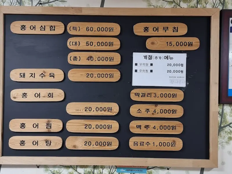 문을 열고 들어서자, 예상대로 아담한 공간이 눈에 들어왔습니다. 테이블 수는 많지 않았지만, 오히려 그 점이 더욱 정겹게 느껴졌습니다. 마치 어머니의 품처럼 따뜻하고 푸근한 분위기가 감돌았습니다. 벽 한쪽에는 메뉴판이 붙어 있었는데, 나무판에 정갈하게 쓰인 글씨에서 할머니의 손맛이 느껴지는 듯했습니다. 홍어삼합, 홍어회, 홍어탕 등 홍어를 중심으로 한 메뉴들이 주를 이루고 있었고, 돼지수육 같은 메뉴도 눈에 띄었습니다. 저는 망설임 없이 홍어삼합과 홍어탕을 주문했습니다. 과학적 탐구에는 역시 다양한 변수가 필요하니까요.