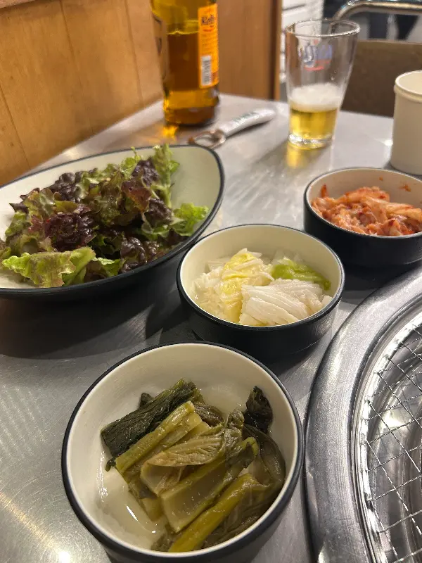 드디어 기다리고 기다리던 마늘 소갈비살이 나왔다. 선명한 붉은 빛깔의 고기 위에 다진 마늘이 듬뿍 올려져 있었다. 참숯이 담긴 화로가 테이블 중앙에 놓이고, 직원분께서 능숙한 솜씨로 불판을 달궈주셨다. 뜨겁게 달궈진 불판 위에 마늘 소갈비살을 올리자, 치익- 하는 소리와 함께 고소한 냄새가 코를 찔렀다. 숯불 향이 은은하게 배어 나오면서 식욕을 자극했다.