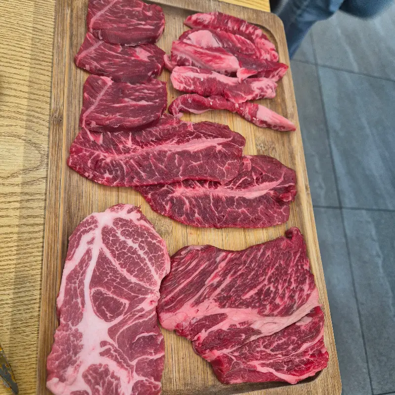 잠시 후, 드디어 기다리고 기다리던 소고기 모듬이 등장했는데, 비주얼 진짜 대박이지 않아? 딱 봐도 신선해 보이는 등심, 갈빗살, 부채살, 토시살, 이베리코 목살까지! 다양한 부위를 한 번에 맛볼 수 있다는 게 무한리필의 가장 큰 매력인 것 같아. 나무 도마 위에 가지런히 놓인 고기들을 보니, 빨리 숯불에 구워 먹고 싶어서 현기증이 날 지경이었어. 특히 선명한 마블링이 박힌 등심의 자태는 황홀 그 자체였어.