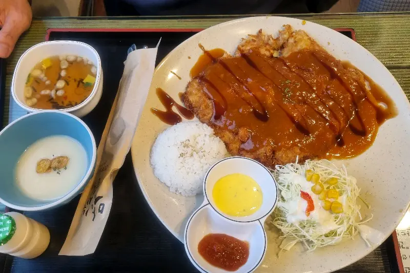드디어 기다리고 기다리던 돈까스가 나왔다. 나무 쟁반 위에 돈까스, 밥, 샐러드, 소스, 장국, 심지어 후식 요구르트까지 정갈하게 담겨 나왔다. 돈까스 위에는 윤기가 자르르 흐르는 소스가 듬뿍 뿌려져 있었고, 샐러드 위에는 콘 샐러드가 앙증맞게 올려져 있었다. 한눈에 보기에도 양이 푸짐해서, ‘양이 많다’는 리뷰가 왜 많은지 단번에 알 수 있었다. 돈까스 한 조각을 들어 입으로 가져갔다. 바삭! 하는 소리와 함께, 고소한 튀김옷과 부드러운 돼지고기가 입안 가득 퍼져 나갔다.