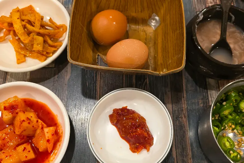 잠시 기다리니, 드디어 콩나물국밥이 나왔다. 쟁반 위에 뽀얀 김을 뿜어내는 뚝배기와 함께 정갈한 반찬들이 함께 차려졌다. 깍두기, 어묵볶음, 젓갈, 그리고 특이하게도 날계란 두 개가 나무 그릇에 담겨 나왔다. 콩나물국밥에 날계란을 넣어 먹는 건 처음이라 신기했다.
