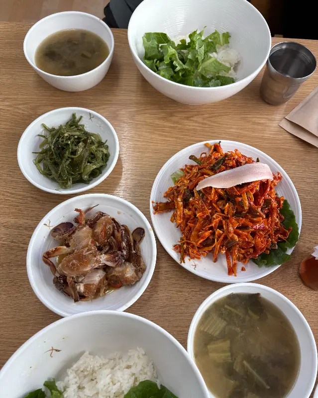 주문을 마치자, 따뜻한 숭늉과 밑반찬들이 테이블 위로 하나둘씩 차려졌다. 짭조름한 미역줄기볶음, 구수한 된장국, 그리고 빼놓을 수 없는 간장게장까지. 특히 간장게장은, 밴댕이회무침 못지않은 인기를 자랑하는 메뉴라고 한다.