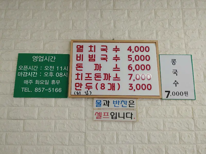 가게 내부는 깔끔하고 정돈된 모습이었다. 테이블은 몇 개 없었지만, 오히려 그 덕분에 아늑하고 편안한 분위기가 느껴졌다. 벽면에는 메뉴판이 붙어 있었는데, 멸치국수, 비빔국수, 돈까스 등 추억을 자극하는 메뉴들이 눈에 띄었다. 가격 또한 요즘 보기 드물게 착해서 더욱 마음이 끌렸다.