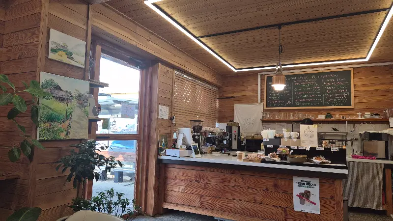 내부는 나무를 주재료로 사용하여 따뜻하고 편안한 분위기를 연출했다. 은은한 조명 아래, 나무 테이블과 의자가 정갈하게 놓여 있었고, 벽에는 아기자기한 그림들이 걸려 있었다. 커다란 창밖으로는 푸르른 시골 풍경이 펼쳐져, 마치 한 폭의 그림 같은 느낌을 자아냈다.