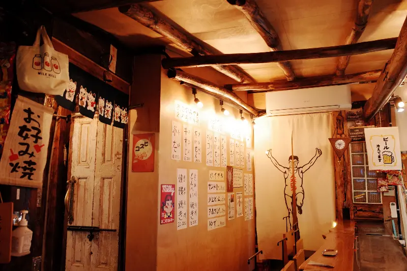 내부는 아늑하면서도 일본 특유의 분위기가 물씬 풍겼어. 나무로 된 인테리어에 은은한 조명, 그리고 다찌 테이블이 눈에 띄었지. 마치 일본 심야 식당에 들어온 듯한 기분! 다찌 테이블에 앉으니, 바로 눈앞에서 오코노미야끼를 만드는 과정을 볼 수 있어서 완전 꿀잼이었다. 철판 위에서 펼쳐지는 화려한 불쇼에 눈을 뗄 수가 없더라.