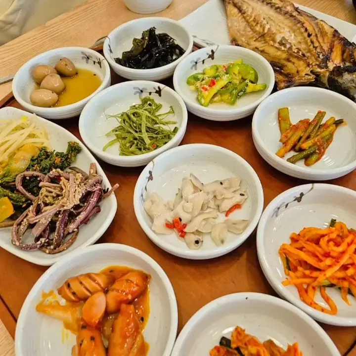 주문을 마치자마자, 테이블 위로 순식간에 반찬들이 촤라락 깔리기 시작했다. 와… 진짜 입이 떡 벌어지는 비주얼! 쟁반 가득 채워진 형형색색의 반찬들을 보니, 마치 할머니 댁 밥상에 온 듯 푸근하고 정겨운 느낌이 들었다.