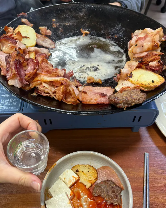 주문이 끝나기가 무섭게, 솥뚜껑이 테이블 위에 놓였다. 큼지막한 솥뚜껑 위에는 베이컨, 햄, 두부, 감자 등이 푸짐하게 담겨 있었다. 그리고 이 집의 필살기라 할 수 있는 살얼음 낀 무생채와 파김치가 함께 나왔다.