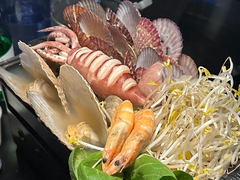 드디어 기다리고 기다리던 바차 바다찜 등장! 비주얼 진짜 대박…!! 커다란 사각 철판에 각종 해산물이 가득 담겨 나오는데, 입이 떡 벌어졌다. 싱싱한 가리비, 큼지막한 새우, 쫄깃한 오징어, 그리고 시원한 국물까지! 사진으로 봤을 때도 기대했지만, 실제로 보니 훨씬 더 푸짐하고 먹음직스러웠다. 마치 바다를 통째로 옮겨 놓은 듯한 느낌이랄까? 빨갛게 달아오른 가리비 껍데기와 통통한 새우, 쭈글거리는 낙지 다리가 한데 모여 시각적인 향연을 이룬다. 녹색 채소와 뽀얀 숙주가 색감의 균형을 잡아주면서 식욕을 더욱 자극한다.