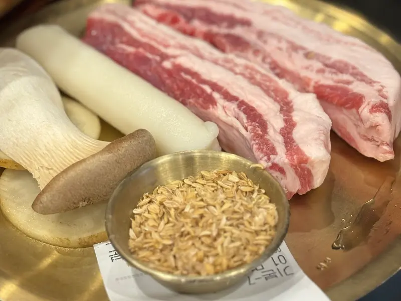 드디어 기다리고 기다리던 겹살이 등장! 땟깔 좋은 돼지고기, 큼지막한 새송이버섯, 떡까지 한 접시에 담겨 나오는데, 정말이지 군침이 싹 돌았습니다. 고기 표면에 칼집이 촘촘하게 들어가 있는 게, 육즙이 빠져나가지 않도록 세심하게 신경 쓴 모습이었어요.
