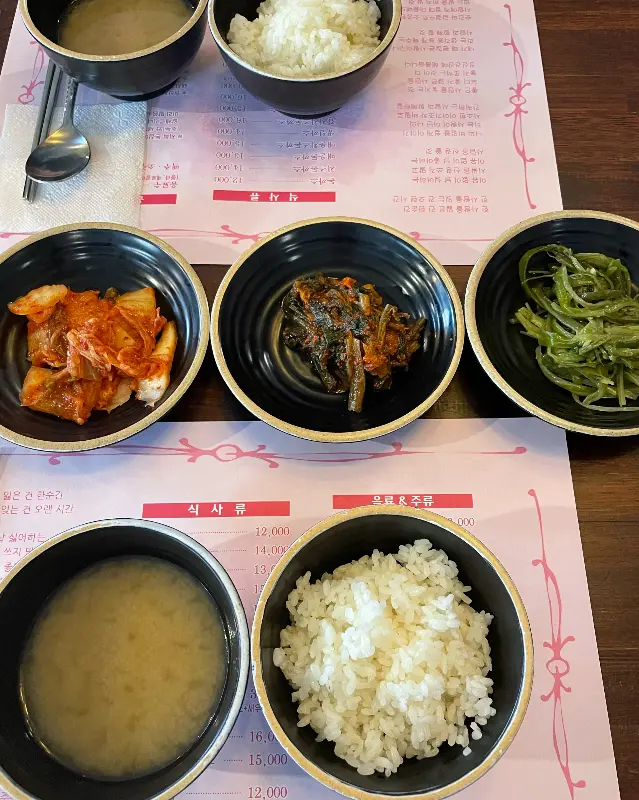 주문을 마치자, 밑반찬이 빠르게 세팅되었다. 김치, 갓김치, 미역줄기 무침, 그리고 따뜻한 된장국과 밥. 특히 갓김치가 밑반찬으로 나오는 점이 인상적이다. 갓김치의 알싸한 맛은 돈까스의 느끼함을 잡아주는 훌륭한 조력자가 될 것이다. 마치 실험을 위한 완벽한 세팅이 끝난 기분이랄까.