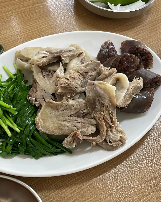 를 보면, 윤기가 흐르는 수육과 찰순대가 먹음직스럽게 담겨 있다. 돼지 특유의 잡내는 전혀 느껴지지 않았고, 신선한 재료를 사용했음을 알 수 있었다. 곁들여진 부추는 색감의 조화를 이루며 식욕을 자극했다.