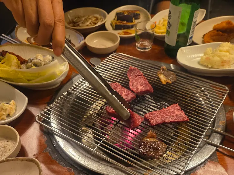 숯불 위에서 지글지글 익어가는 소고기. 냄새부터가 황홀경이다. 겉은 노릇하게, 속은 촉촉하게 익혀서 한 입 먹으니… 와, 진짜 입에서 살살 녹는다는 표현이 딱이다. 육즙이 팡팡 터지고, 고소한 풍미가 입안 가득 퍼진다. 쉴 새 없이 나오는 맛있는 반찬들과 함께 먹으니, 행복이 따로 없다.