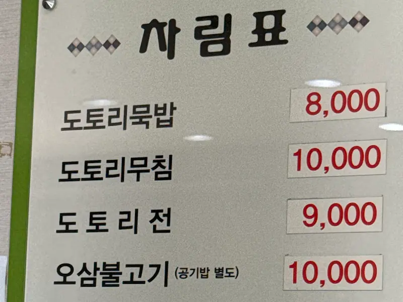 주차장에 차를 대고 딱 내리는 순간, 훅 끼쳐오는 시골의 향긋한 풀 내음. 도시의 찌든 때가 씻겨 내려가는 기분, 마치 디톡스 랩을 하는 느낌이랄까? 식당 문을 열고 들어서니, 생각보다 넓고 깔끔한 공간이 펼쳐졌어. 테이블 간 간격도 넉넉해서 편안하게 식사를 즐길 수 있겠더라. 벽에 붙은 메뉴판을 스캔하니, 도토리묵밥이 메인이고, 오삼불고기, 도토리전 같은 메뉴들도 눈에 띄었어. 가격도 착해. 도토리묵밥이 8천 원, 오삼불고기가 1만 원이라니, 가성비가 마치 내 플로우처럼 흘러넘치는구만.