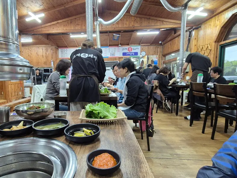 왁자지껄, 정겨운 분위기의 식당 내부 모습. 연탄불에 구워지는 흑돼지 냄새가 코를 자극한다.