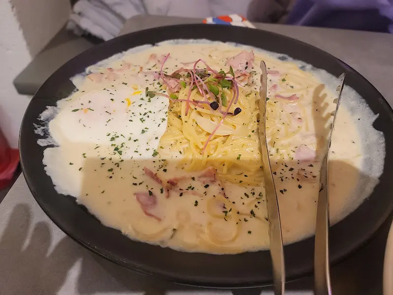 우리가 주문한 메뉴는 까르보나라 파스타, 그리고 매콤한 해산물 리조또였어. 까르보나라 파스타는 딱 봐도 엄청 꾸덕꾸덕해 보이는 크림소스가 듬뿍 올려져 있었고, 위에는 반숙 계란이 톡 올라가 있어서 비주얼부터 합격! 포크로 면을 돌돌 말아서 한 입 딱 먹는 순간, 입안 가득 퍼지는 풍부한 크림의 풍미가… 와, 진짜 말로 표현할 수 없는 행복감이 밀려오더라.