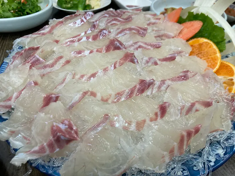 자리에 앉아 메뉴를 살펴보니, 자연산 횟집답게 그날 가장 신선한 생선들이 저를 유혹했습니다. 사장님께서는 싱싱한 황돔이 좋다고 추천해주셨습니다. 3명이서 먹기에 충분한 1kg을 주문했습니다. 잠시 후, 기대감에 부푼 저의 눈앞에 황홀한 자태를 뽐내는 황돔회가 등장했습니다.