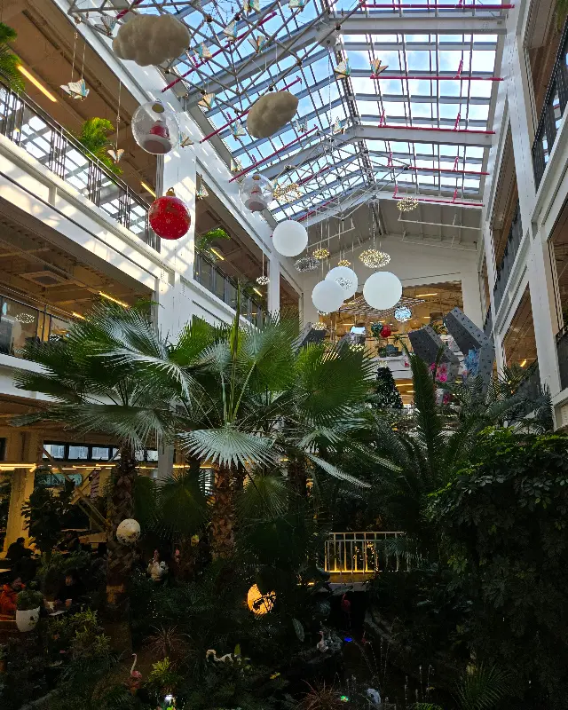 카페에 들어서자마자 가장 먼저 나를 사로잡은 것은 압도적인 공간감이었다. 높은 천장과 넓은 홀, 그리고 그 안에 가득 찬 푸르른 식물들이 마치 거대한 온실에 들어온 듯한 착각을 불러일으켰다. 에서 볼 수 있듯, 천장에는 독특한 조형물이 설치되어 있고, 곳곳에 배치된 식물들은 실내에 생기를 불어넣고 있었다. 이산화탄소 농도가 짙었던 연구실을 벗어나, 싱그러운 산소를 만끽하는 순간, 뇌는 즉각적인 쾌감을 느끼며 엔도르핀을 분비하기 시작했다.