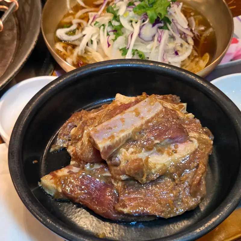 달콤하면서도 짭짤한 양념이 입안 가득 퍼져 나갔다. 돼지갈비는 입에서 살살 녹는 듯 부드러웠다. 숯불 향이 은은하게 배어 있어 풍미를 더했다. 과하지 않은 단맛이 질리지 않고 계속 먹게 만들었다. 왜 이곳이 독산동 맛집으로 불리는지, 왜 많은 사람들이 돼지갈비를 추천하는지 알 것 같았다.