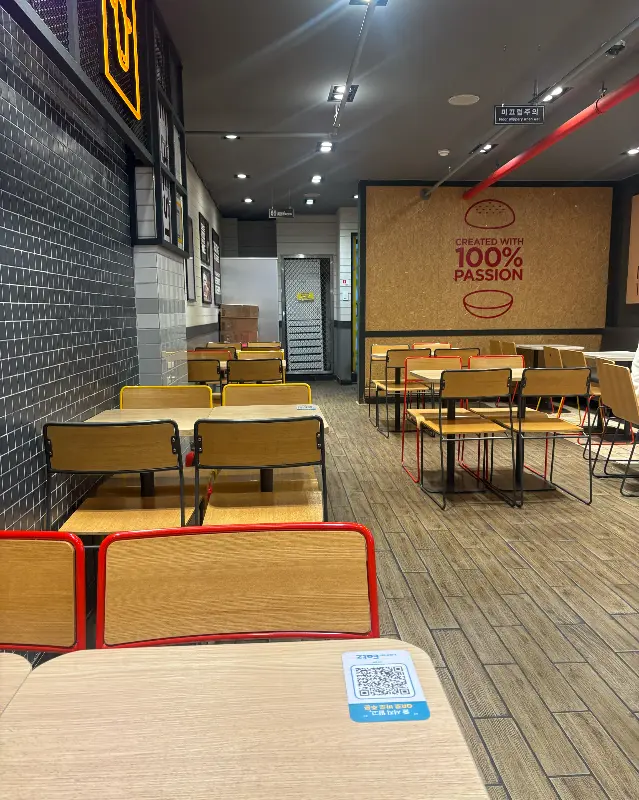 시청 로터리 바로 앞에 위치한 롯데리아 동해점은, 멀리서도 눈에 띄는 깔끔한 외관을 자랑했다. 매장 안으로 들어서니 넓고 쾌적한 공간이 펼쳐졌다. 은은한 조명 아래 나무 소재 테이블과 의자가 따뜻한 분위기를 자아냈다. 벽면에는 햄버거 사진과 함께 “CREATED WITH 100% PASSION”이라는 문구가 적혀 있어, 이곳이 맛에 대한 열정으로 가득 찬 곳임을 암시하는 듯했다. 창밖으로는 동해 시내 풍경이 한눈에 들어와, 혼자만의 시간을 보내기에도 안성맞춤이었다.
