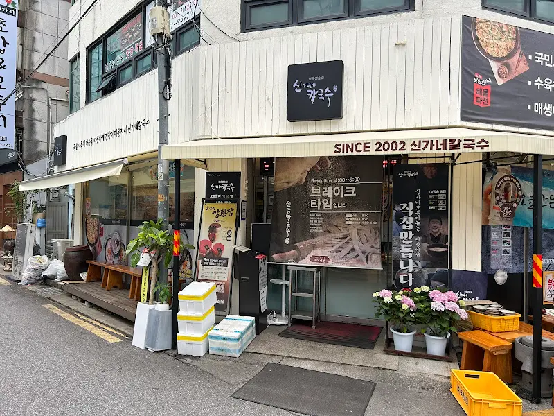 골목 어귀에 자리 잡은 ‘신가네칼국수’는 멀리서 봐도 아, 여기구나! 싶더라. 2002년부터 이 자리에서 쭉 있었다는데, 간판에서 느껴지는 세월의 흔적이랄까? 뭔가 숨겨진 내공이 느껴지는 분위기였어. 가게 앞에 놓인 아기자기한 화분들이 정겨움을 더했고. 하얀색 간판에 검은 글씨로 큼지막하게 쓰여진 ‘신가네칼국수’는 한눈에 쏙 들어왔어.