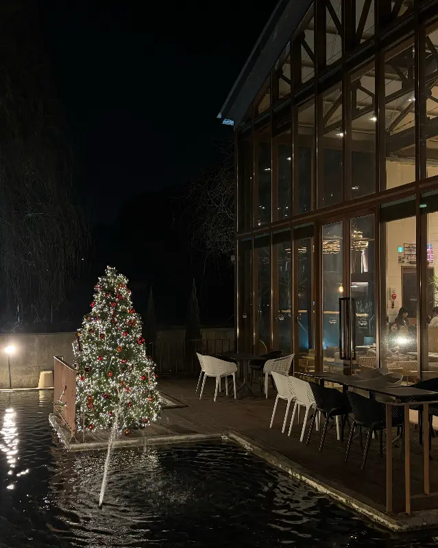 밤에 본 카페 안낙 외부 전경. 조명과 트리가 아름답게 어우러져 환상적인 분위기를 자아낸다.