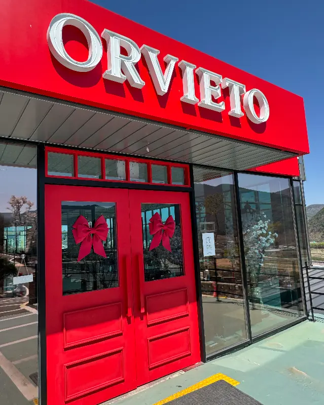 도착하자마자 웅장한 외관에 압도당했어. 마치 유럽의 고풍스러운 저택 같은 느낌이랄까? 빨간색 문과 흰색 글씨로 쓰인 “ORVIETO” 간판이 강렬하게 시선을 사로잡았어. 문 앞에 서니, 마치 다른 세계로 통하는 문을 여는 듯한 설렘이 밀려왔지.