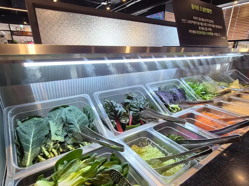 넓고 쾌적한 공간, 은은하게 퍼지는 따뜻한 조명이 편안함을 더했다. 입구에 들어서자마자 눈에 띈 것은 싱싱한 채소들이 가득한 샐러드바였다. 형형색색의 채소들이 마치 봄의 정원을 옮겨 놓은 듯 싱그러움을 뽐내고 있었다. 청결하게 관리된 샐러드바는 보기만 해도 기분이 좋아지는 그런 공간이었다.