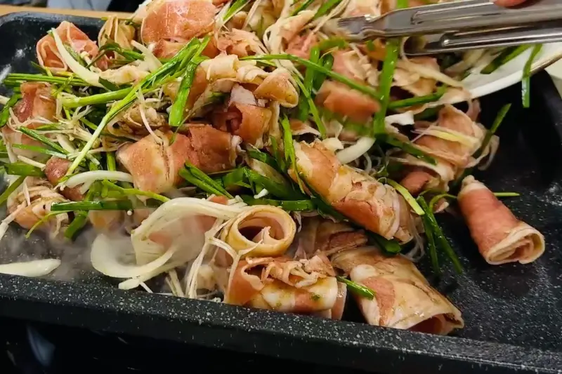 드디어 기다리고 기다리던 오리불고기가 등장했다. 수북하게 쌓인 오리불고기 위로 양파, 부추, 팽이버섯이 듬뿍 올려져 있었다. 시각적으로도 압도적인 비주얼은 감탄을 자아냈다. 얇게 썰린 오리고기는 신선함이 느껴졌고, 채소들과 어우러진 모습은 먹음직스러움을 더했다. 불판 위에 올려진 오리불고기는 지글거리는 소리와 함께 서서히 익어갔다.