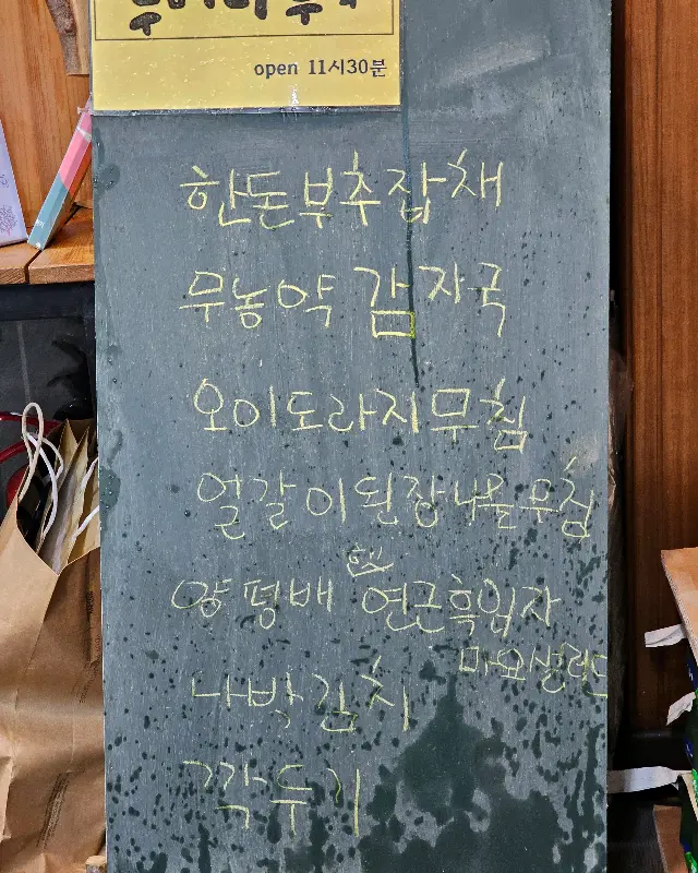 메뉴는 단 하나, 오늘의 백반! 매일매일 바뀌는 메뉴 덕분에 질릴 틈이 없다고 한다. 벽에 붙은 메뉴판을 보니 ‘오늘의 시시백반’이라고 적혀있고, 예쁜 손글씨로 오늘의 메뉴가 적혀 있었다. 예쁜 손님 밥상은 10,000원, 조합식구는 9,000원이다. 1인 백반 주문이 기본이라고 하니, 혼밥러에게 이보다 더 좋을 순 없다. 어떤 날은 닭갈비가, 어떤 날은 코다리조림이 나온다니 정말 기대가 된다. 오늘은 어떤 메뉴일까? 칠판에는 한 겨울 부추잡채, 무농약 감자국, 오이도라지무침, 얼갈이된장나물무침, 콩깨 연근흑임자, 나박김치, 깍두기 라고 적혀 있었다.